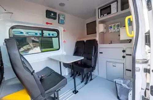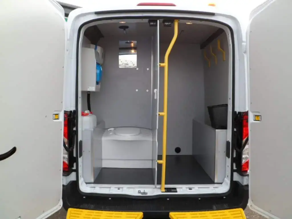 Each van includes toilets, handwashing stations, seating, heating, and refreshment areas